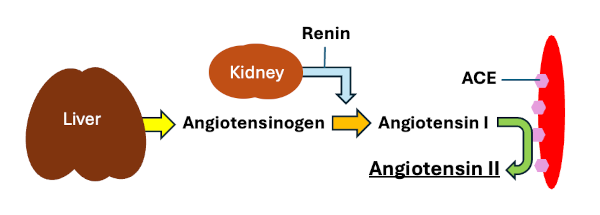 The action hero of this endocrine system is a small 8 amino acide peptide called angiotensin II, but like many fictional action heros, it becomes a hero in several stops. A short and understated description of the importance of angiotensin II is that it a key regulator of blood volume and peripheral vascular resistance. Additionally, it acts in concert with aldosterone from the adrenal gland to normalize disturbances in electrolyte balance, particular sodium and potassium. One thing is certain: if you are in a serious car accident or perhaps a sword fight, and lose a lot of blood, you will want a your renin-angiotensin-aldosterone system in top shape.