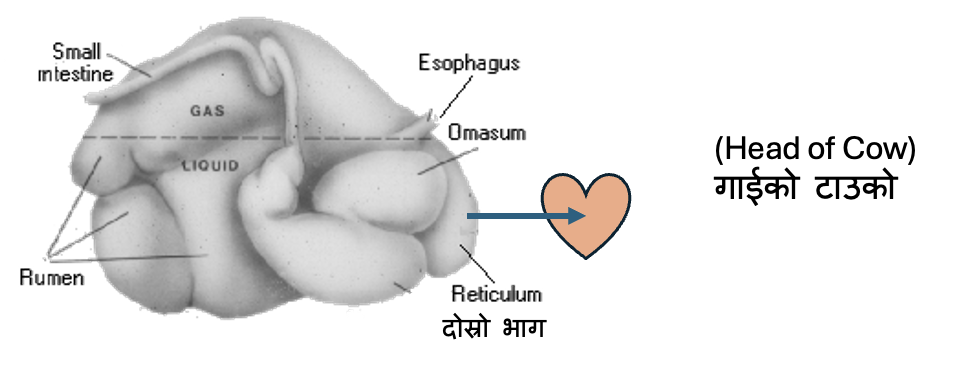 गाइ-भैसीले किला‑काँटी खाए पछि लाग्ने रोग बारे बुझ्न पहिले तिनको पाचन नली कस्तो हुन्छ भनी जान्न आवश्यक छ। जनवारलाई दाहिनातिरबाट हेर्दा तिनको पेटको के कस्तो भाग देखिन्छ भन्ने कुरा तल दिइएको चित्रमा देखाइएको छ। उग्राउने जनावरहरु (गाई, भैँसी, बाख्रा, भेडा) को पेटको चार भागहरु हुन्छ। याद गर्नुहोला भैंसेपेटको(रूमेन) अगाडीको खण्डलाई जालोपेट (रेटिकुलम) भनिन्छ। अन्ननली (ओसोफेगस) र जालोपेटको ठिक पछाडीपट्टि भैंसेपेट हुन्छ। त्यसैले भारी वस्तुहरू (जस्तै फलामको टुक्राहरु) यही भैंसेपेटमा जम्मा हुन्छन्। यदि तपाईँलाई उग्राउने जनावरहरुको पाचन नलीको रचनाविज्ञानको बारेमा जान्न मन छ भने, यो वेबसाइटमा जानुहोस्। Digestive Anatomy in Ruminants